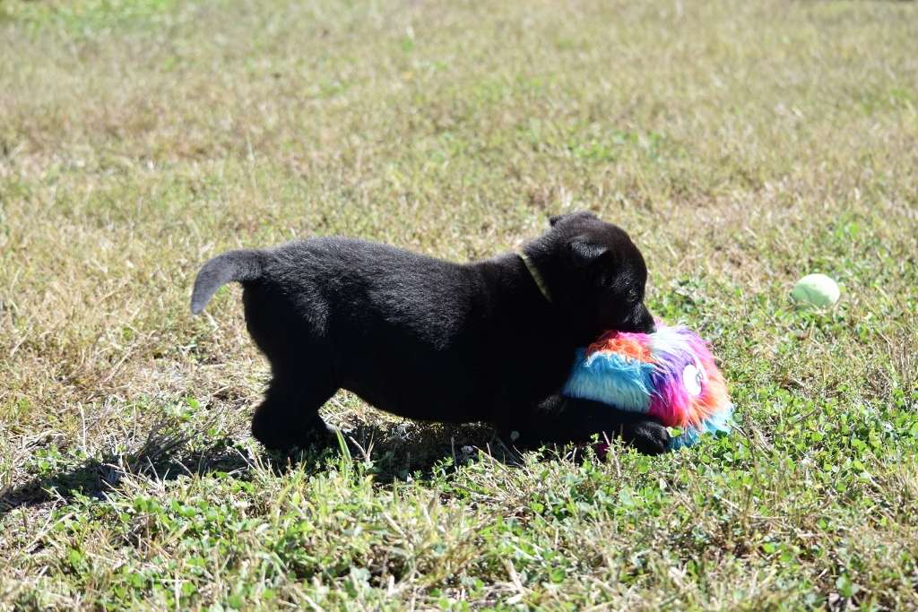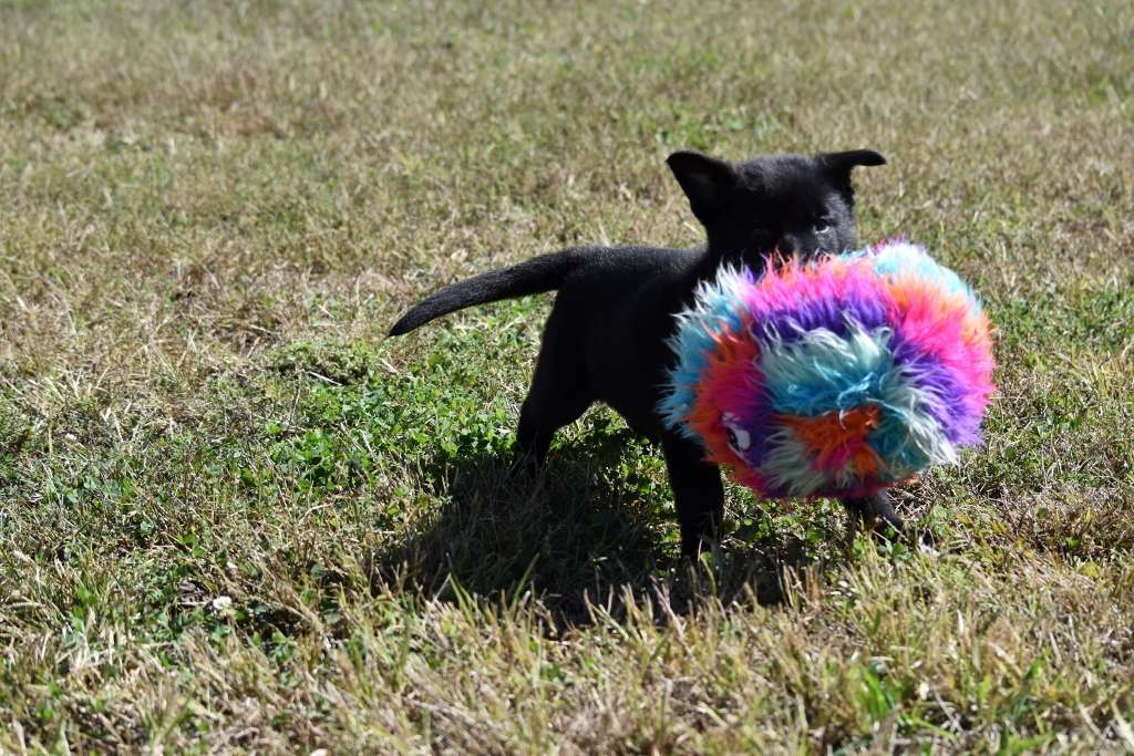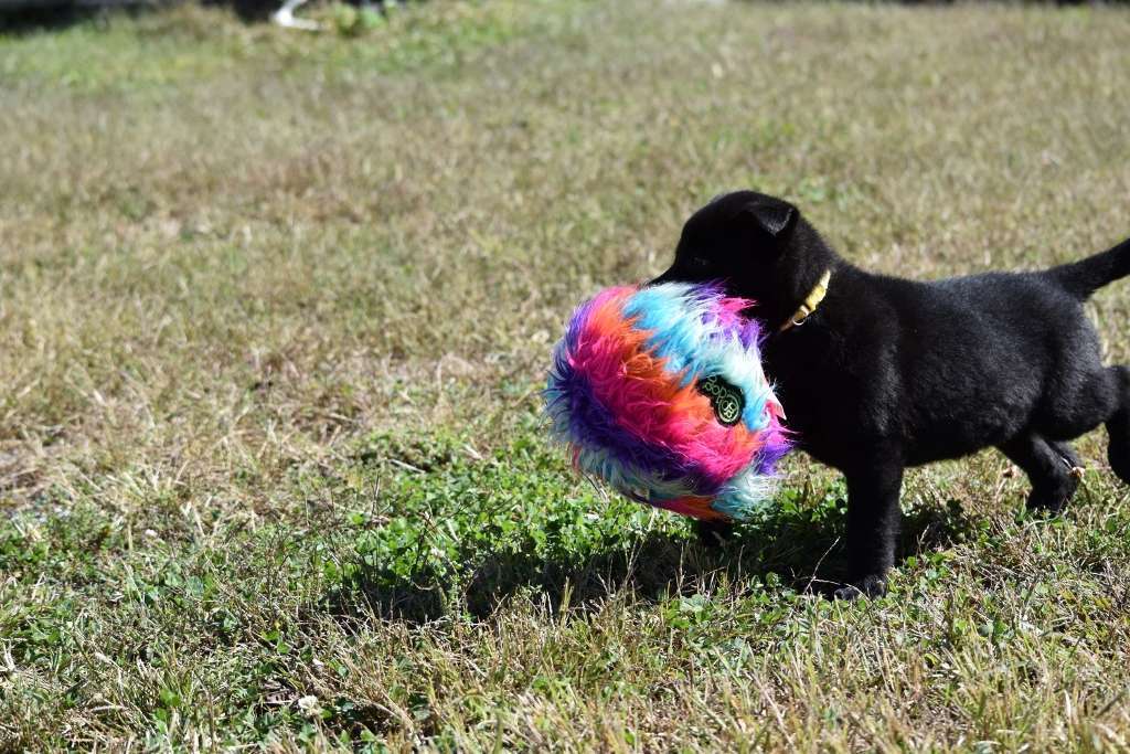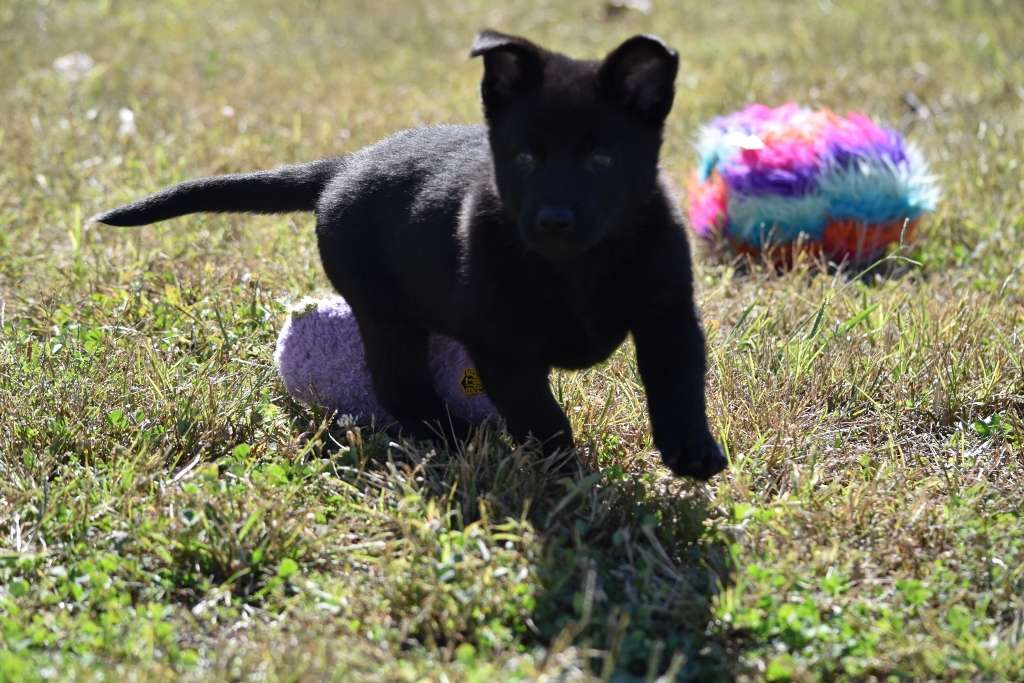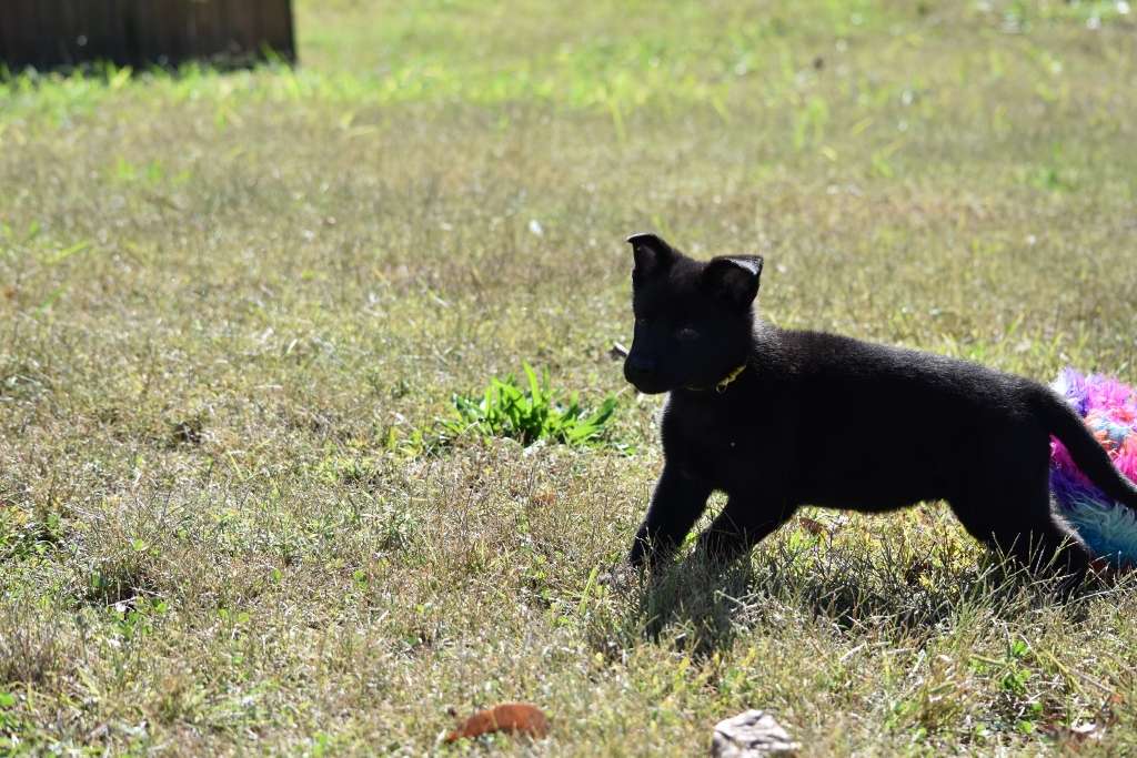 Dahlia is a solid black female from Cinder and Creed's litter born 8/29/25. She is the little stinker in the litter, very outgoing and a tiny bit mischievous. She loves to play and interact with people, she has good toy and food drive, which will make training really easy. She loves attention and will do anything to get it. She can obviously carry object larger than herself (see picture with ball). She is started on house training, She has been vet checked and is current on vaccines She is microchipped as well. She is currently available. If you would like any more info please feel free to call or text 423-595-8317 or email camelotshepherds@gmail.com