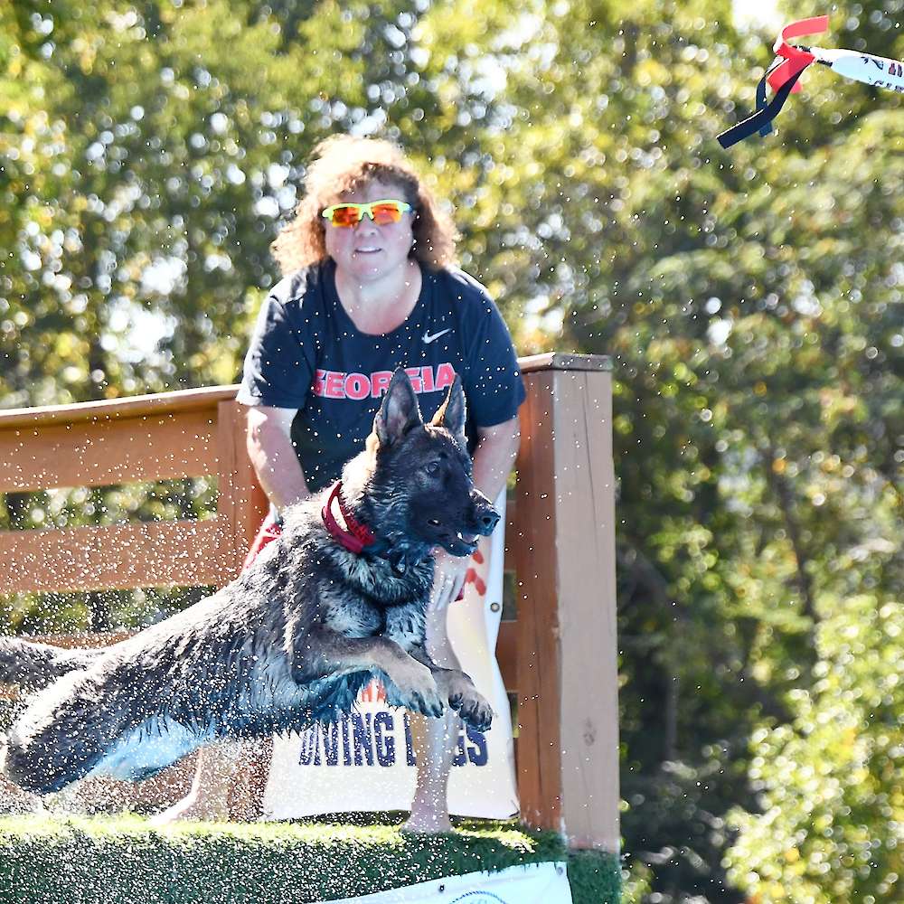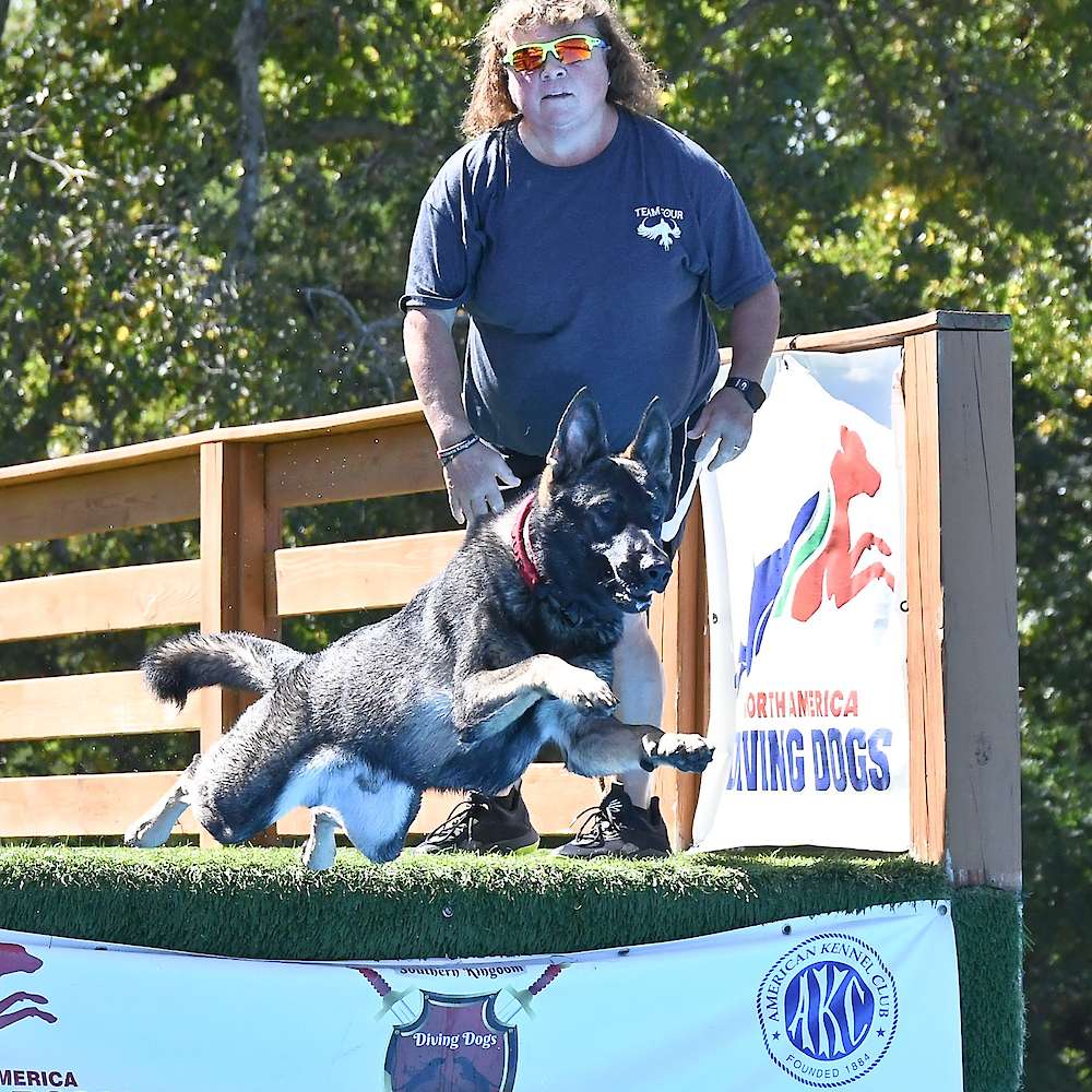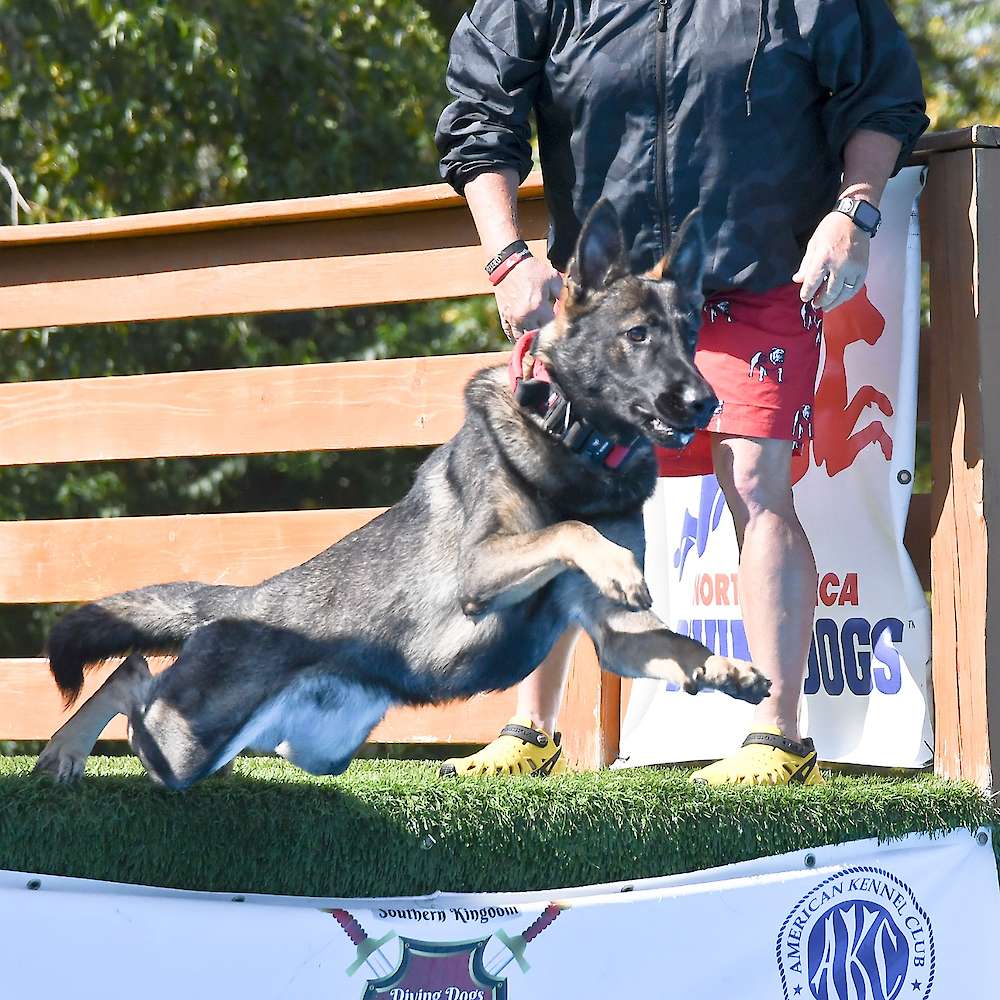 Four is our upcoming young Stud dog, he is from Cinder and Groot's breeding and is a really nice male. He is currently competing in Dock Diving, Nosework and participating in bitework as well. He is extremely well rounded, social and outgoing. He has drive for days, but has a nice off switch as well. He can settle in and watch TV as well as he can come down the dock like a screaming demon. He is excelling in Nosework and will be competing for his NW1 in a few weeks. He has an excellent overall structure and is a beautiful black sable. We have great expectations for him as part of our breeding program. Four is owned and handled by Theresa Smith. They are an awesome team to watch! Four has been Penn Hip certified and OFA prelims. His Pennhip score is .28/.32 and his Elbows are Normal. He is DM clear by parentage, but we have submitted an Embark as well.