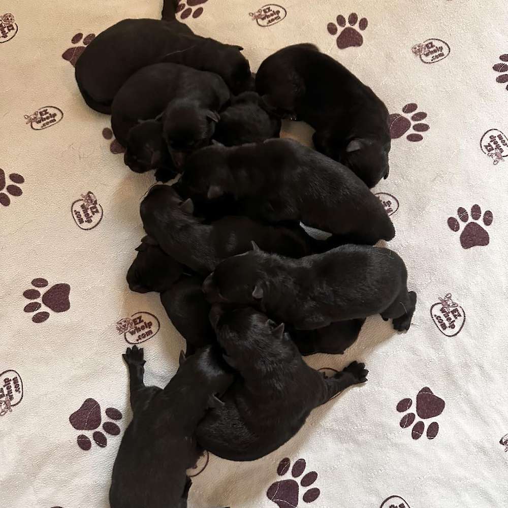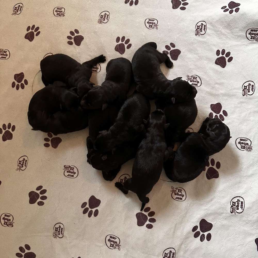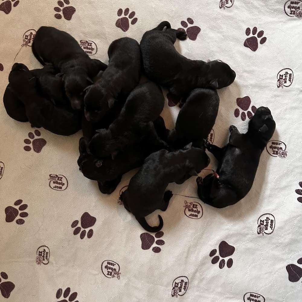Cinder and Ready pups born Saturday 4/20, 11 little bundles of joy! 6 males and 5 females. All solid black. Puppies will go home 6/15/24 @ 12pm .The word for this litter is versatility, the pedigree of these puppies is phenomenal, the parents are so versatile and do so many different things. Cinder is currently working in bite sports, dock diving, Ready is working in PSA and loves dock diving as well. Both dogs are social and outgoing, they both are extremely affectionate dogs and love attention, they both love working, but also just love being with me and snuggling. Ready, as big as he is, is a huge love bug. This litter should be phenomenal, large solid black puppies with nice working drive, environmentally sound and beautiful structure. Great sport prospects and home and family protectors.